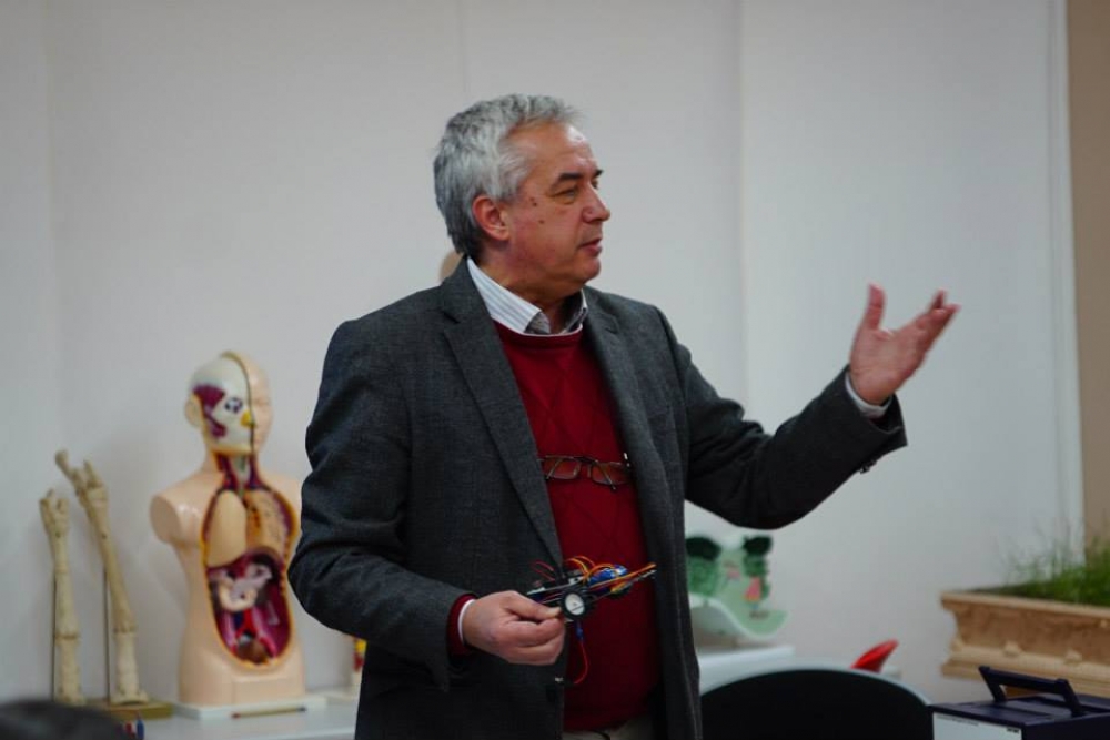 “Усилиями учеников старших классов GG был создан робот, который умеет различать черный и белый цвета и двигается по заданной траектории - черной линии. Робот создавался с целью изучения программных и оптических задач. Изучая их, ученики 6 класса за три занятия усвоили полный курс десятого класса по геометрической оптике.» - рассказывает Профессор Сонгулашвили.