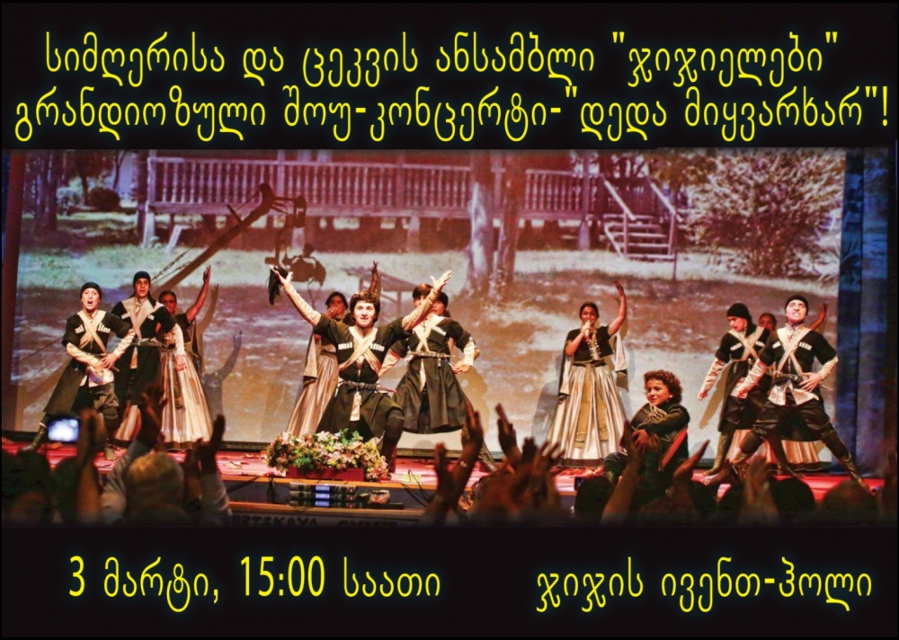3 მარტს, 15:00 საათზე, ჯიჯის ივენთ-ჰოლში გაიმართება ანსამბლი "ჯიჯიელების", საზეიმო, გრანდიოზული შოუ-კონცერტი - "დედა, მიყვარხარ"!